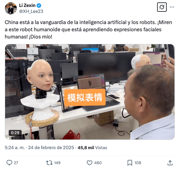 Robots con emociones: El nuevo rostro de la IA. Un robot con rostro humano ha logrado replicar expresiones emocionales de manera convincente, marcando un avance en la interacción humano-máquina. Fuente: Li Zexin en X